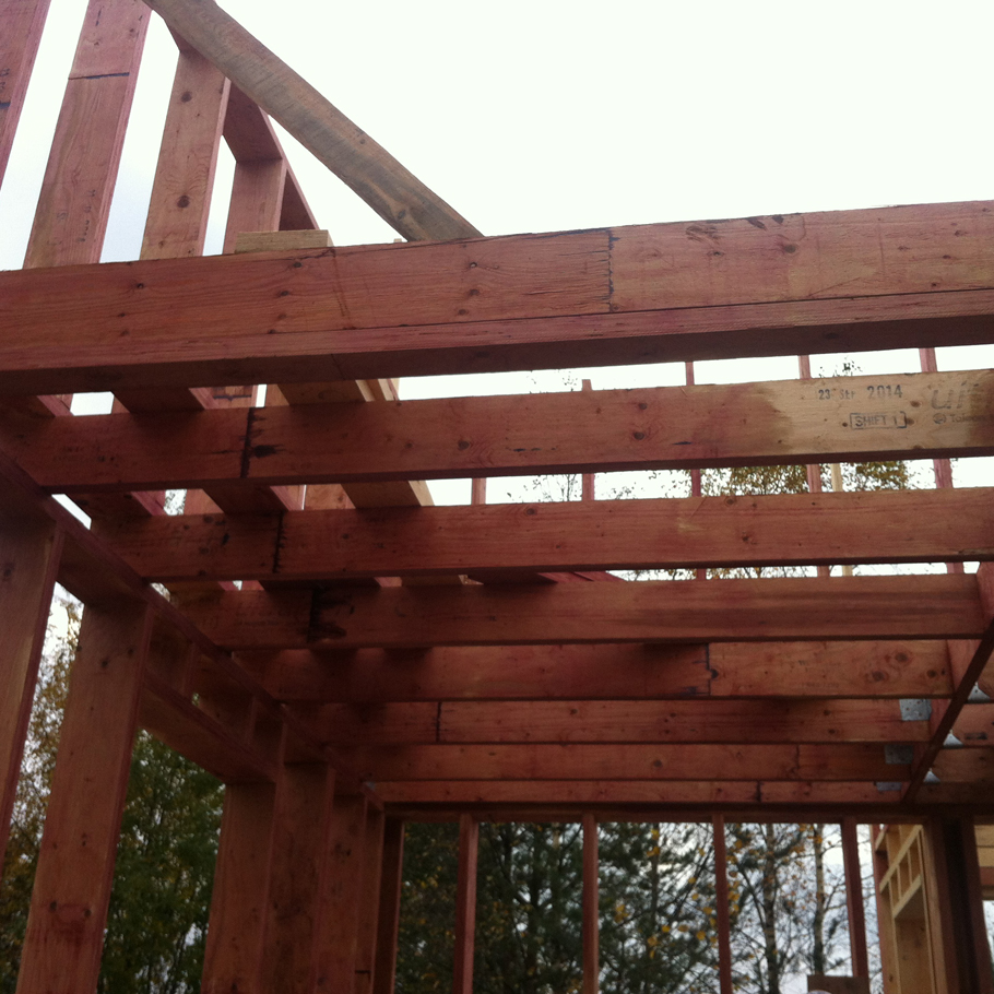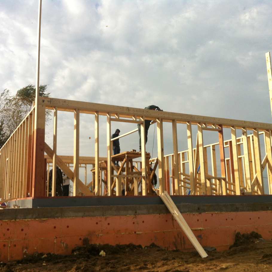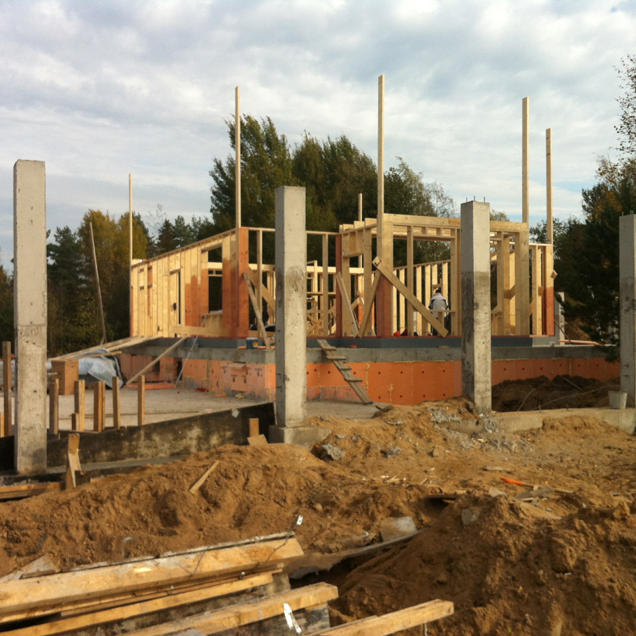 Монтаж стоек первого этажа из ЛВЛ бруса |